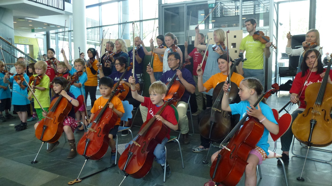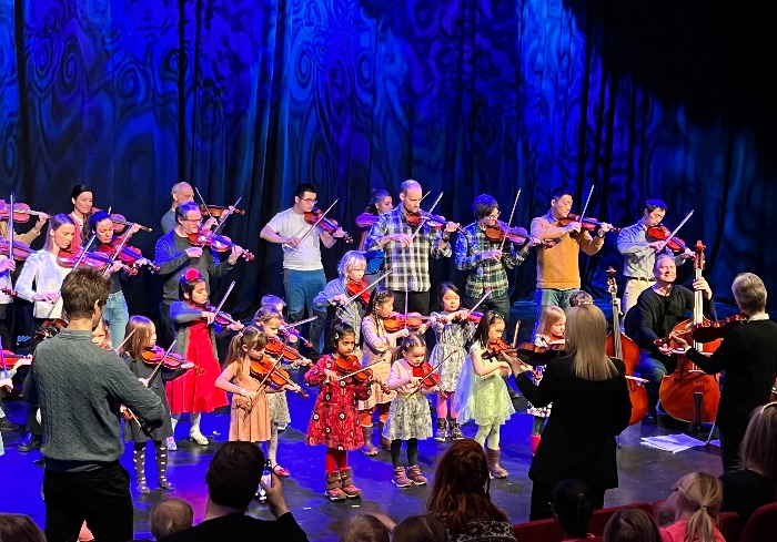 Tilbud for de yngste (5 - 6 år), fiolin, bratsj, cello eller kontrabass. Voksne lærer samtidig med barna sine.